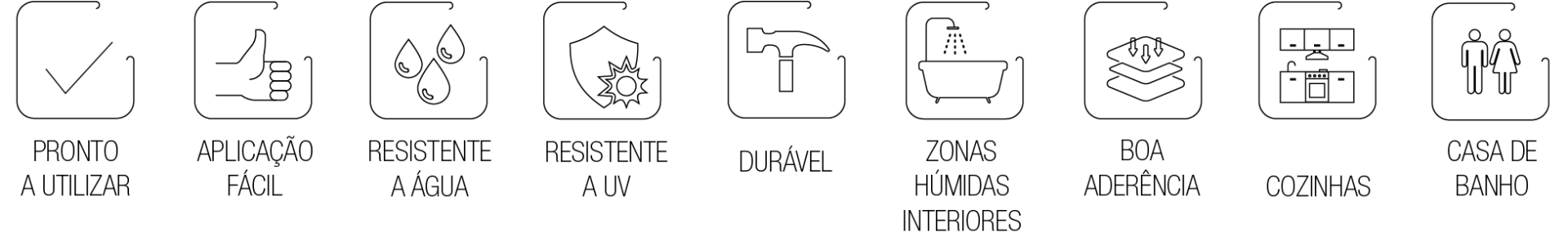 - Excelente aderência, sem necessidade de primário, à generalidade das superfícies tais como: vidro, superfícies vidradas ou esmaltadas, cerâmica, painéis em epóxi ou poliéster, poliestireno, PVC, aço inoxidável, alumínio e madeira.
